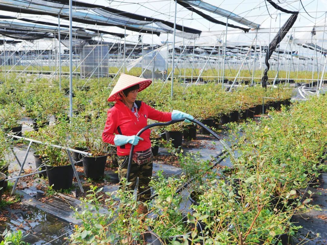 “我们的蓝莓特点是花香浓、甜度高,但现在还不能吃。”基地负责人孙高说:“最近是蓝莓果的膨大期,20多名工人每天分散在各个大棚里,喷洒叶面肥、除杂草,给蓝莓补营养。同时分批浇水,冲去多余的酸度和盐分,再过一周,头批成熟的蓝莓就会变得又大又甜了。”
